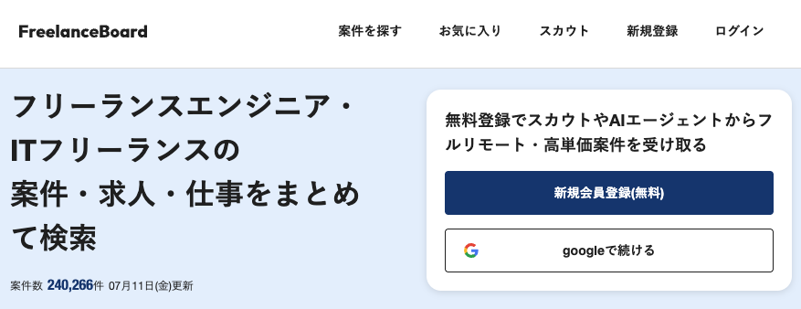 フリーランスボードは、フリーランスエンジニア・ITフリーランス向けの案件検索プラットフォームとして2024年5月にリリースされました。従来のフリーランスエージェントとは異なり、複数のエージェントが保有する案件を一括で検索・比較できるサービスとして、ITフリーランス業界で注目を集めています。