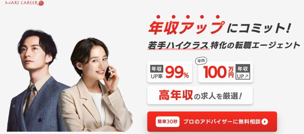 マーズキャリアは、「今よりもっと市場価値を高めたい」「年収を確実に上げたい」 という20代~30代前半の若手ハイクラス層に向けた転職エージェントです。
