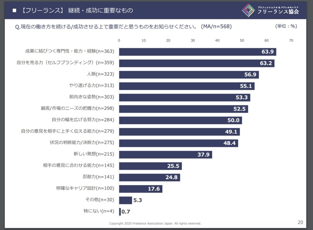 セルフブランディングがフリーランスにとっていかに重要かを示すデータがあります。フリーランス協会の調査によると、現在の働き方を続け、成功させる上で重要だと考えられる要素として、「自分を売る力(セルフブランディング)」が全体の63.2%で2位に挙げられています。これは「成果に結びつく専門性・能力・経験」(63.9%)に次いで高い結果であり、フリーランサーにとってセルフブランディングがいかに不可欠かを物語っています。