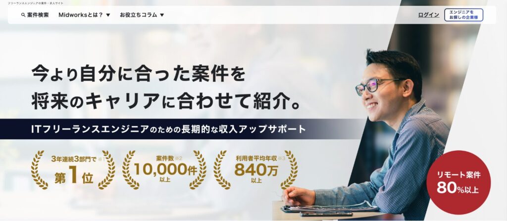Midworksは、エンジニアやデザイナーに特化した案件紹介サービスで、週3日からの副業案件が豊富に揃っています。