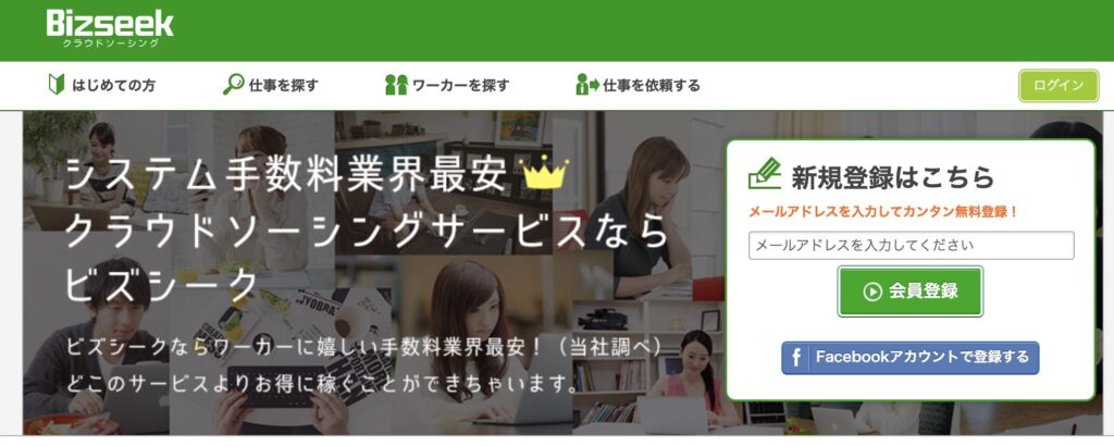 Bizseekは、手数料が安いクラウドソーシングプラットフォームで、主にデザインやライティング、Web関連の仕事が多数掲載されています。