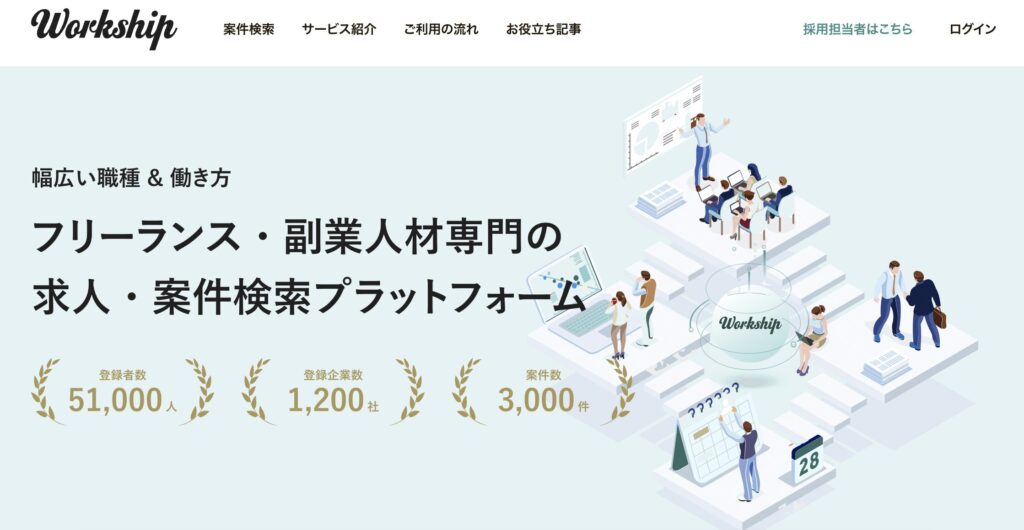Workshipはデザイナー、エンジニア、マーケター、編集者など、デジタル業界で活躍するプロフェッショナルと企業をマッチングするサービスです。ジョブ型雇用支援サービスとして、プロフェッショナルが新しい技術や仕組みづくりに挑戦できる環境を提供します。特に、週1~3日稼働やリモート案件が多く、副業初心者にも最適です。無料で会員登録し、マッチ度の高いプロジェクトを探せるため、効率的に案件を見つけられます。