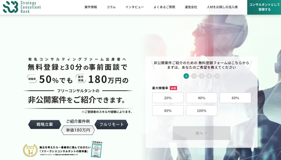 Strategy Consultant Bankは、戦略・業務案件を中心とした高単価案件を数多く提供するプラットフォームです。
