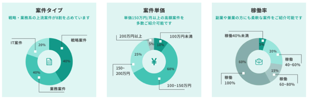 コンサルティング業界に強いネットワークを持ち、大手企業やスタートアップ企業を含む幅広いクライアント基盤を活かして、高品質な案件をフリーランスに提供しています。また、コンサルティング業界出身のプロフェッショナルが多数在籍しており、候補者一人ひとりのスキルと希望条件に寄り添ったサポートを行う点が特徴です。